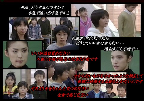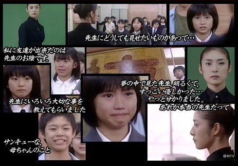 看到真矢家裡面調查學生的資料,和美零分的考卷附註"因為中途離席",還有學生們哭泣著道歉,真矢離去時的那段話,由介的母親出現,還有學生們為了真矢唱的驪歌,最後一幕真矢對和美說thank you......